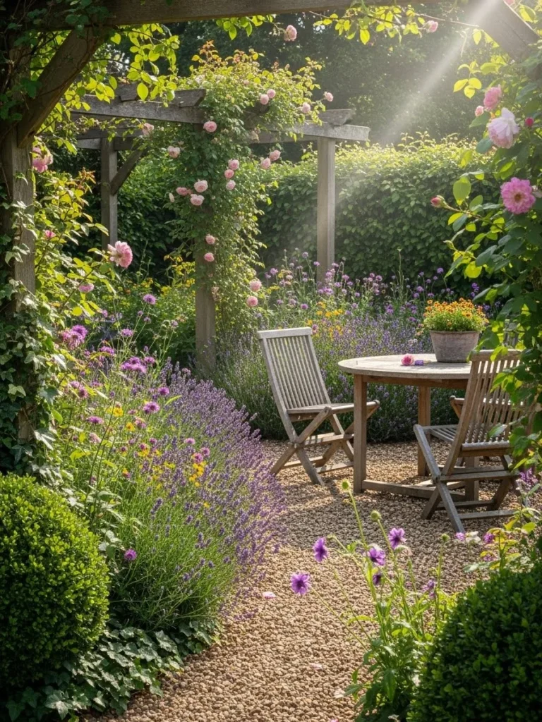 5. A Rustic or Cottage-Style Gravel Patio Surrounded by Greenery