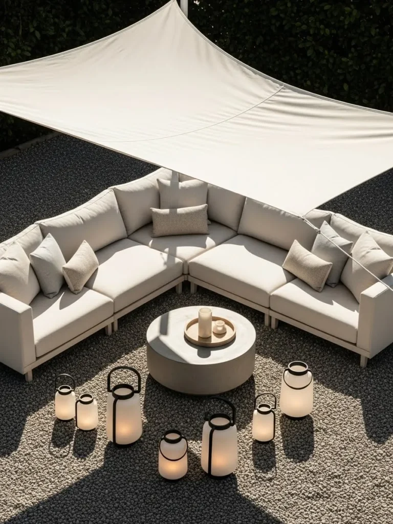 6. A Gravel Lounge Patio with Outdoor Sofas, Pillows, and Shade Features