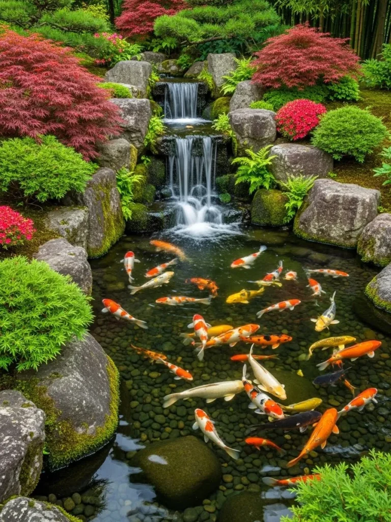 To enhance this waterfall’s beauty, consider adding floating plants, bamboo features, or Japanese lanterns for a more authentic look. LED underwater lights can illuminate the pond at night, highlighting the colorful koi as they swim. This waterfall also attracts birds and butterflies, adding biodiversity to your outdoor space. Whether you prefer a minimal design or an elaborate garden layout, a koi pond waterfall brings unmatched charm and peaceful energy to your backyard.