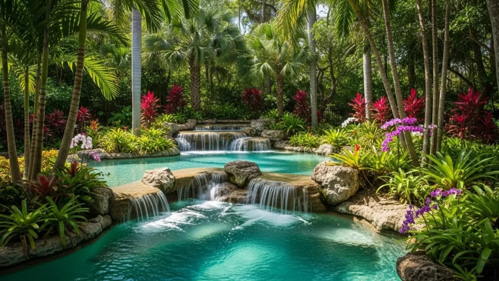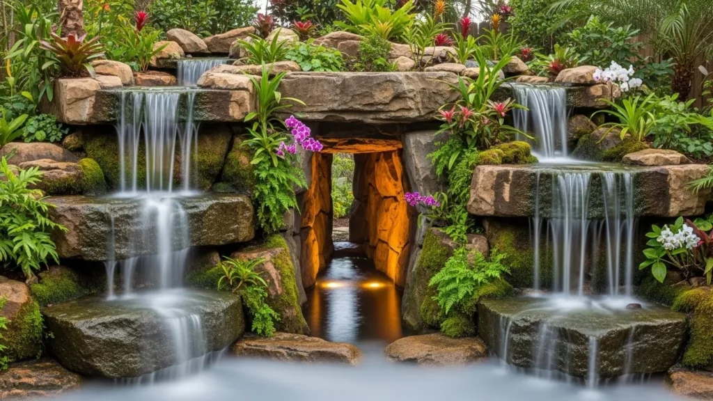 To enhance the tropical feel, you can add bamboo accents, tiki torches, or driftwood around the edges. The waterfall’s gentle flow creates a soft, refreshing sound that enhances the calming ambiance. Incorporating underwater lighting gives the lagoon a magical glow after sunset. This style is especially perfect for poolside areas, turning your backyard into a resort-like escape. With thoughtful plant choices and water features, this waterfall transforms ordinary outdoor spaces into exotic retreats.