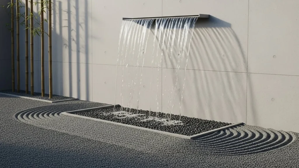 To complete the Zen aesthetic, surround the waterfall with bamboo, raked gravel, bonsai trees, or smooth river stones. Soft lighting can be added to enhance the tranquil atmosphere in the evenings. The low-maintenance nature of this waterfall makes it ideal for busy homeowners who still want a peaceful retreat. Its simple, modern elegance can complement almost any outdoor environment, creating a soothing corner where you can escape daily stress and reconnect with nature.