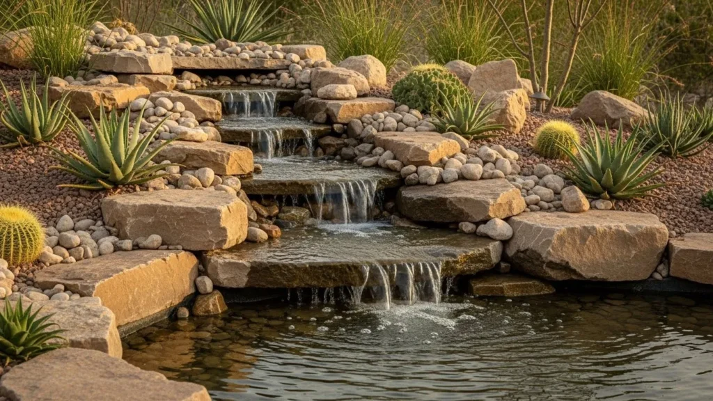 A rock garden waterfall is a perfect blend of rugged natural beauty and effortless elegance. Featuring layered stones and carefully placed boulders, this design allows water to cascade gently into a shallow basin or pond. It blends beautifully with succulents, drought-tolerant plants, and gravel pathways, making it ideal for homeowners who want a low-water landscaping solution. The subtle sound of flowing water adds tranquility, turning a simple backyard into a peaceful refuge where nature feels close and calming.
