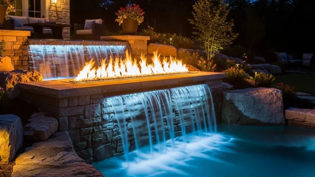 To enhance the effect, consider using fire bowls, linear burners, or recessed flame channels placed above or beside the waterfall. When lit at dusk, the fire illuminates the falling water, creating a magical shimmering glow. This feature pairs beautifully with modern landscaping, lounge seating, or outdoor entertainment areas. Although it requires thoughtful planning, the final result offers unmatched ambiance and sophistication, making your backyard the ultimate evening gathering spot.