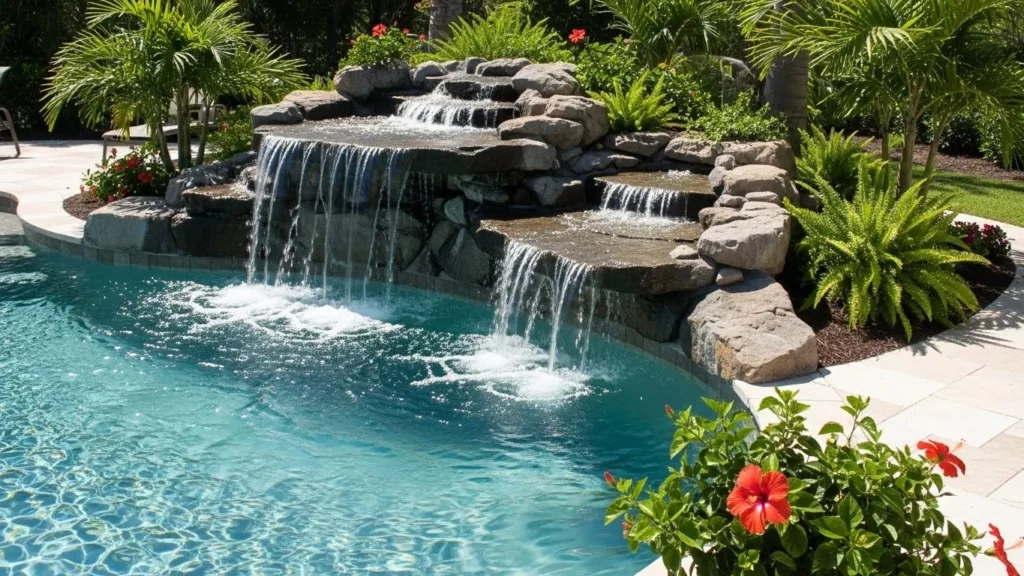 For added visual impact, consider incorporating LED lights behind the waterfall so the water glows in vibrant colors at night. Pairing the waterfall with palm trees, lounge seating, and decorative stones creates a complete getaway vibe. You can choose a small, subtle cascade or a bold, dramatic drop depending on your pool’s design. This feature not only beautifies your yard but also adds value to your home by transforming your pool into a luxurious centerpiece.