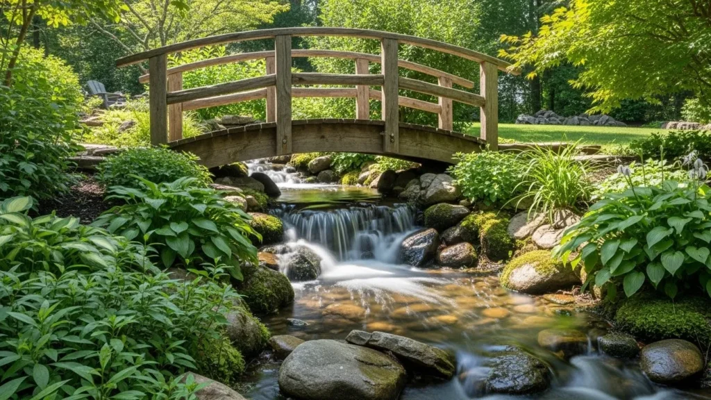 You can enhance the bridge with warm wood stains, railings, or lantern-style lighting to deepen the enchanting atmosphere. Surrounding the area with flowering plants, ferns, or ornamental trees completes the storybook look. Whether you choose a small arched bridge or a straight, minimalist version, the combination of water and wood creates a picturesque focal point. This design turns even an ordinary yard into a romantic, peaceful haven that feels like a scenic garden escape.