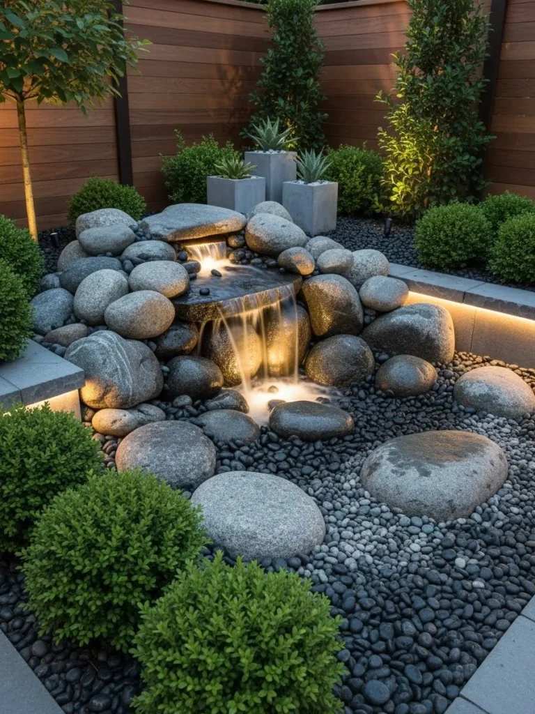 This style is incredibly versatile—you can build it as a compact corner feature or expand it into a larger multi-stone fall. Using a mix of textures, such as rough boulders and polished river stones, enhances the visual appeal. Adding small LED spotlights between the rocks creates shadows and highlights that bring the waterfall to life after dark. Its low-maintenance nature and natural charm make it an excellent choice for anyone seeking a simple yet stunning backyard addition.