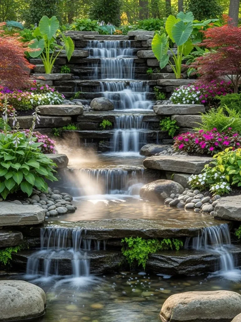 You can enhance the look by pairing the stone steps with ferns, hostas, or mossy patches for an earthy, woodland feel. Landscape lights placed between the steps illuminate each layer, adding depth and charm during evening hours. This waterfall is also highly customizable—use rough stones for a rustic vibe or smooth pavers for a modern look. Its gentle cascade and aesthetic versatility make it a wonderful focal point for meditation, relaxation, or garden enjoyment.