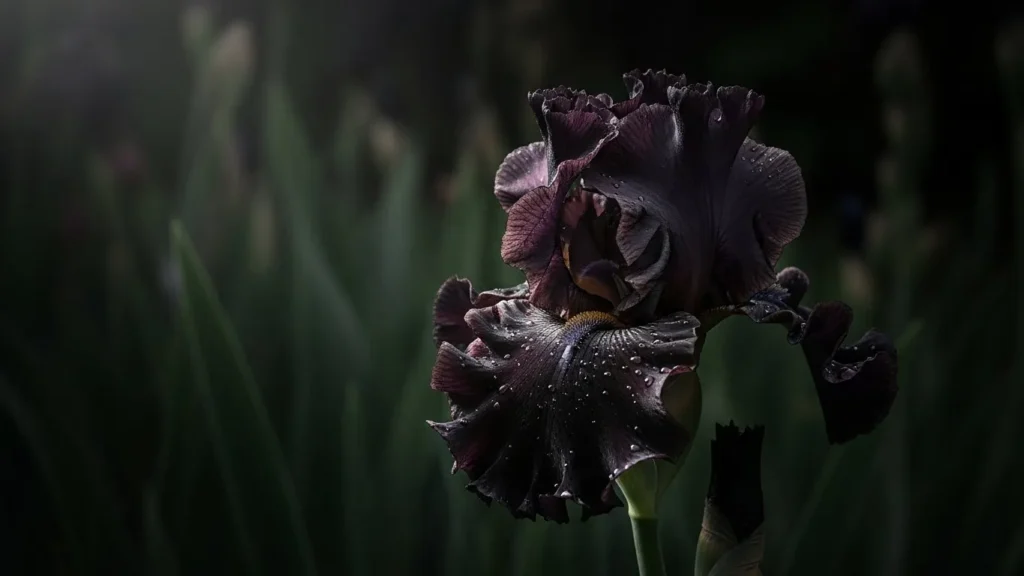 Black iris varieties, especially the variety known as “Before the Storm,” bring a dramatic flair that almost feels theatrical. Their ruffled petals look like layered satin fabric, giving them a sense of luxury and movement. The color ranges from deep plum to near black, making them ideal for gardeners who want to add instant depth.