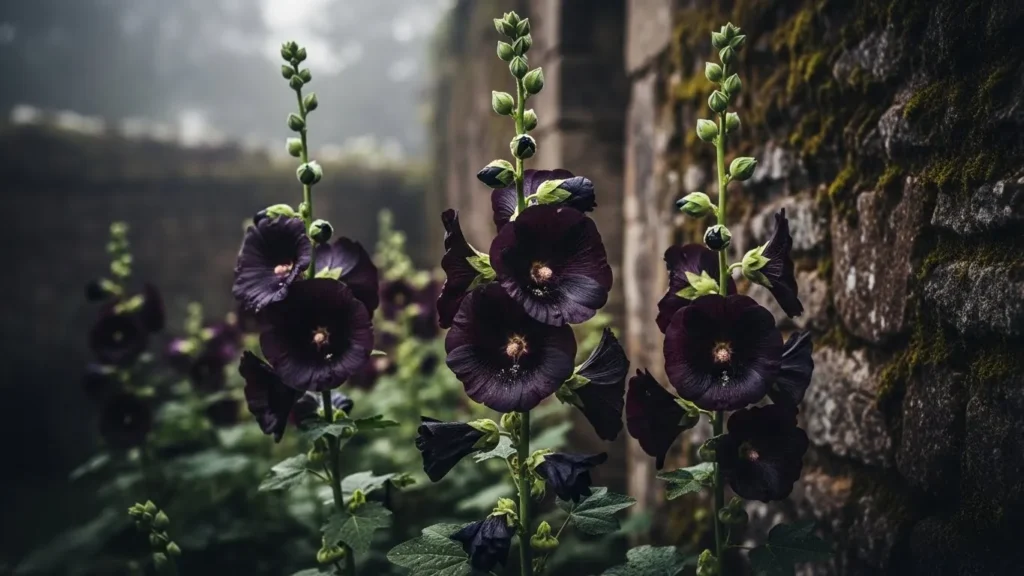 Black hollyhock has been a classic favorite for moody gardens for more than a century. Its tall flower spikes rise dramatically above other plants, giving the garden a vertical structure that instantly creates a sense of height and shadow. These flowers appear almost velvety in certain light, and although they look deep black from a distance, they actually hold dark wine tones that make them shimmer in the sun. Gardeners often place them at the back of borders to create a backdrop that enhances every lighter bloom in front.