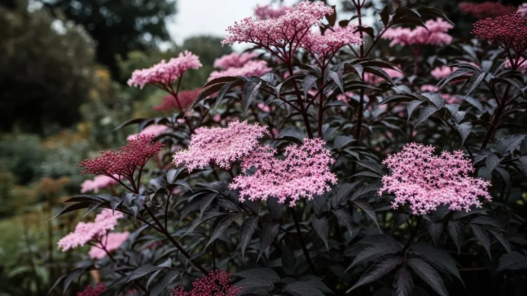 Black Lace Elderberry offers dark, finely cut foliage that resembles black lace or delicate filigree. Its leaves are a deep purple-black that creates an elegant, feathery texture in the garden. What makes it even more interesting is its pink flowers, which appear like soft clouds against the dark background. This contrast builds a beautiful sense of drama that feels soft rather than harsh.