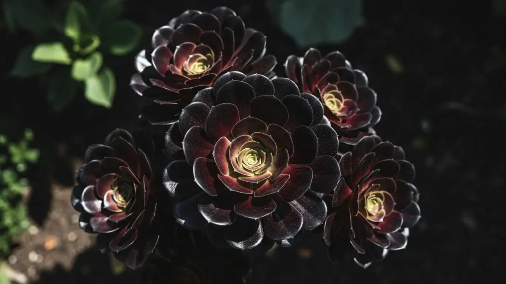 Black Aeonium is a succulent with rosettes so dark they appear nearly black. The glossy texture of its leaves gives it a modern, sculptural quality. This plant is perfect for gardeners looking to create a gothic look without relying entirely on flowers. Its architectural form adds a sense of structure, which is essential for any garden design with a dramatic theme.