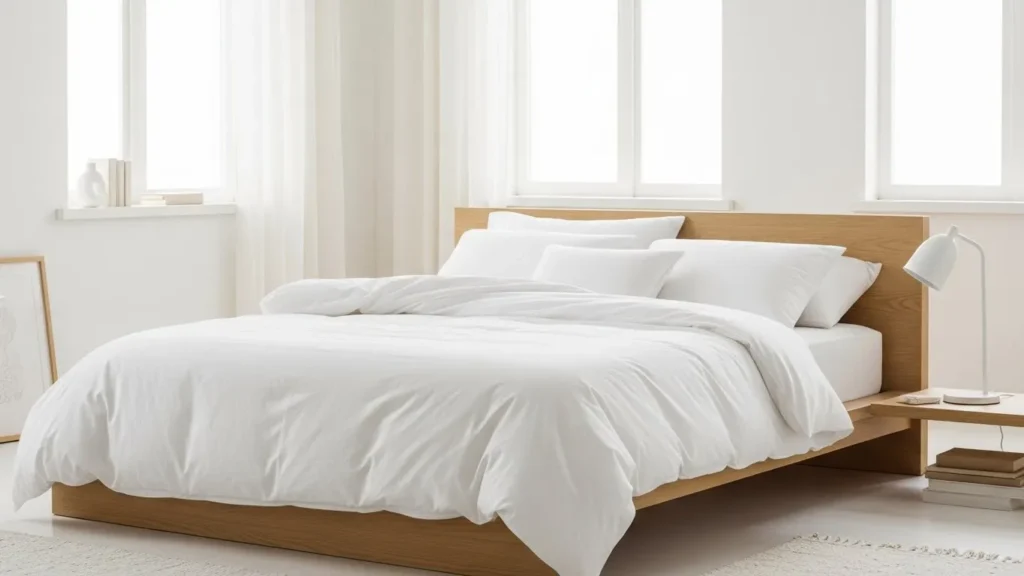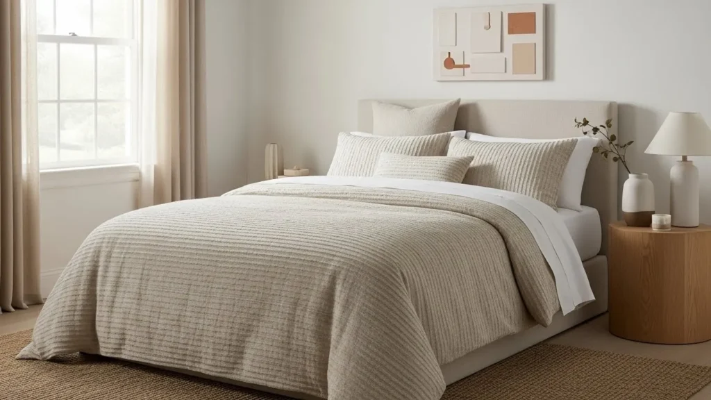 To enhance the effect, add cozy layers such as throw pillows, rugs, or a lightweight blanket. Minimal décor keeps the space uncluttered, allowing the textures and soft hues to shine. Linen and ivory harmony creates a timeless, sophisticated, and Pinterest-ready bedroom that feels both modern and relaxing.