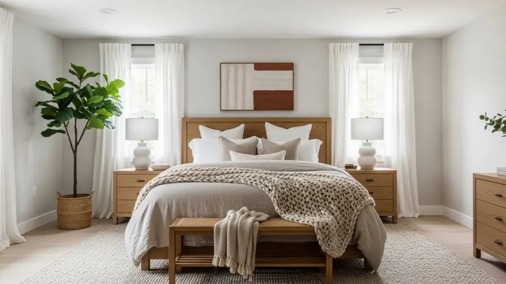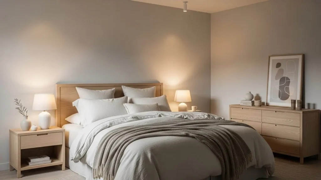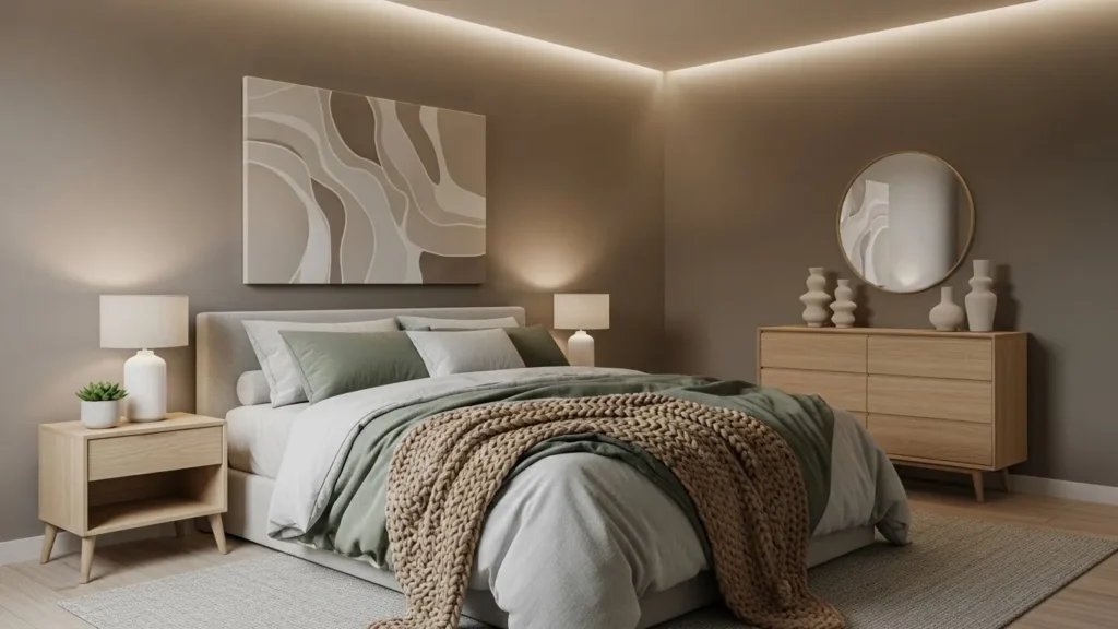 Layered textiles and natural elements such as wood or woven baskets enhance the warmth of greige tones. Soft lighting and minimalist furniture complete the serene atmosphere. This layered approach balances modern sophistication with cozy comfort, making it perfect for Pinterest-inspired neutral bedroom designs.
