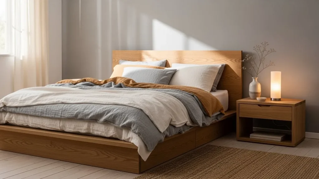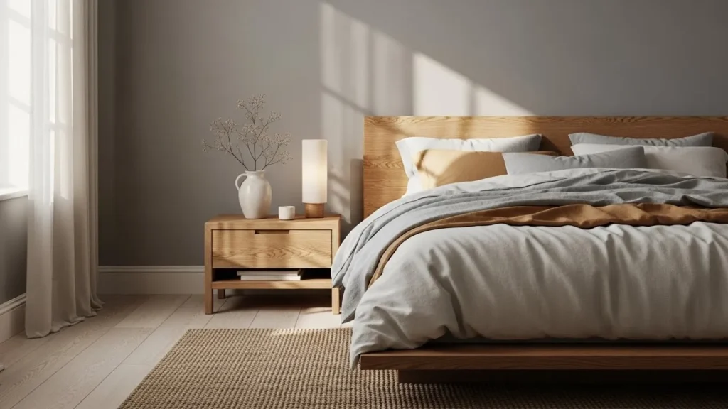 Incorporating natural wood is a top 2026 trend for neutral bedrooms, adding warmth and grounding the space. Light or medium wood tones in bed frames, nightstands, or shelving complement neutral walls like gray, beige, or cream. Wood accents bring an organic feel that balances modern minimalism with cozy charm.