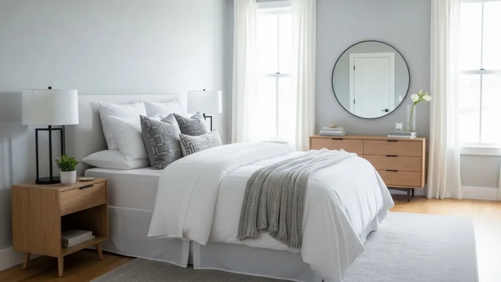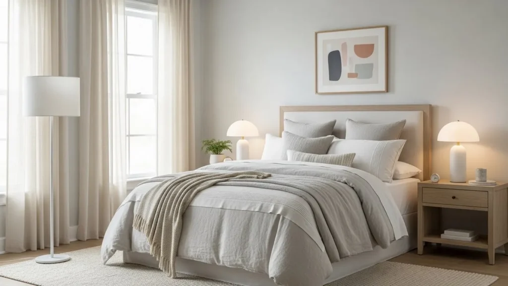 Soft gray walls paired with crisp white bedding create a balanced, neutral palette for 2026 bedrooms. The contrast between gray and white adds sophistication while keeping the room light and spacious. This combination allows for flexibility in décor accents, such as metallic lamps, wooden furniture, or greenery.