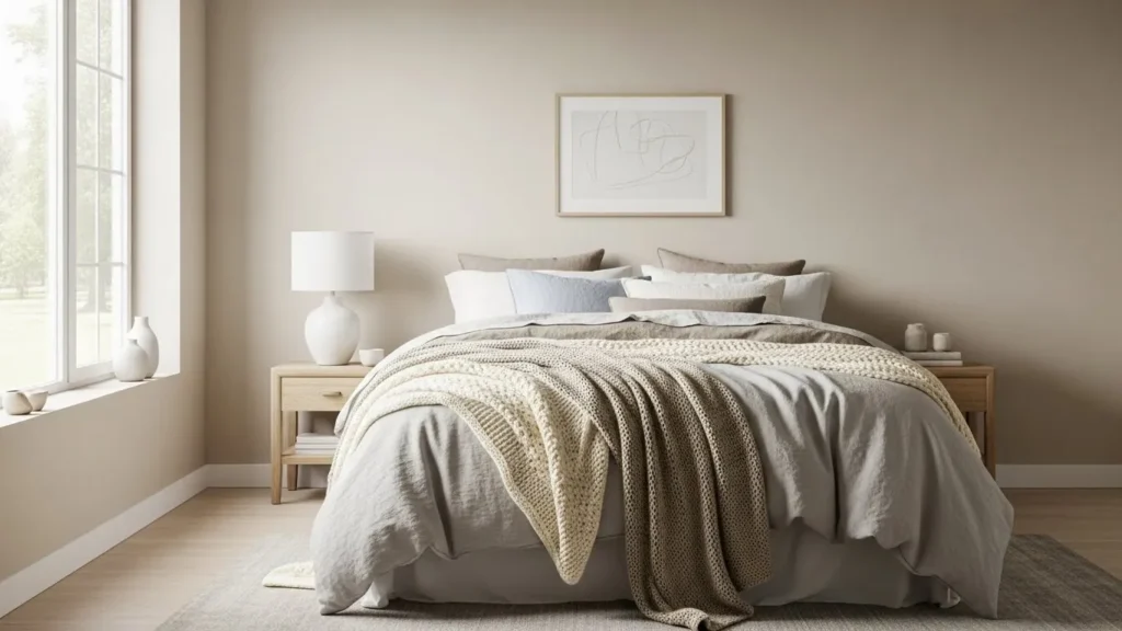 Greige, a blend of gray and beige, remains a neutral favorite in 2026 for creating cozy yet contemporary bedrooms. Warm greige walls paired with complementary bedding and textured rugs create depth while keeping the space inviting. This palette offers flexibility in styling, allowing for muted accent colors like soft taupe or blush.