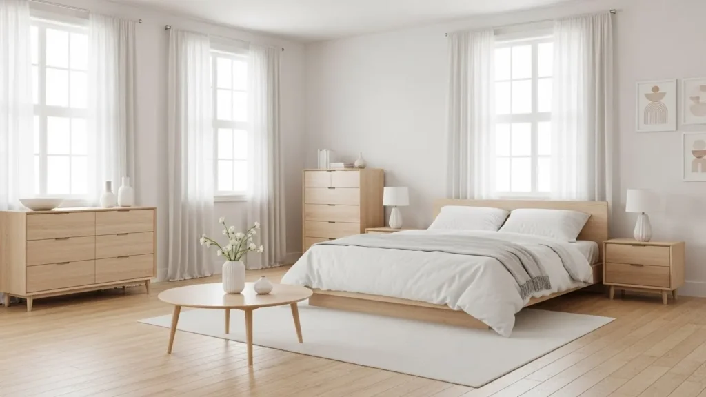 Natural lighting amplifies the airy feel, while minimal décor keeps the room uncluttered. Wooden or rattan accents complement the neutral palette and add organic charm. This combination creates a cozy, inviting bedroom that is perfect for Pinterest-inspired layouts, balancing comfort, style, and timeless elegance.