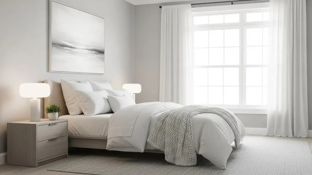 Layered textures such as a woven rug, linen curtains, and knitted throws prevent the palette from feeling flat. Soft ambient lighting enhances the serene vibe, making the room feel cozy and inviting. This timeless gray-and-white approach is ideal for Pinterest-ready bedrooms that are both modern and calming.