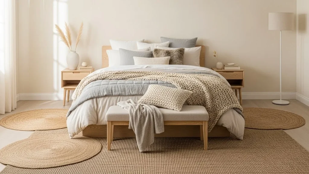 Incorporating various textures like knitted throws, linen curtains, or a soft shag rug adds depth and interest to the space. Minimal furniture and subtle décor ensure the focus remains on the comfort and warmth of the room. Creamy, layered textures are perfect for Pinterest-inspired neutral bedroom designs that feel both elegant and relaxing.