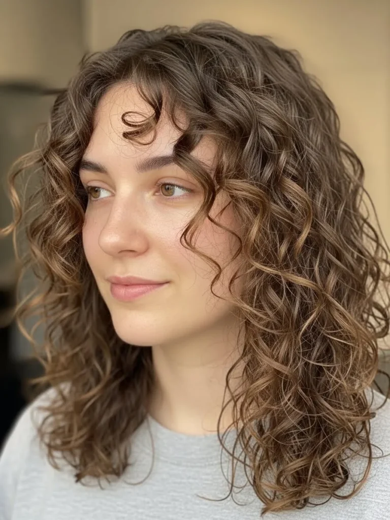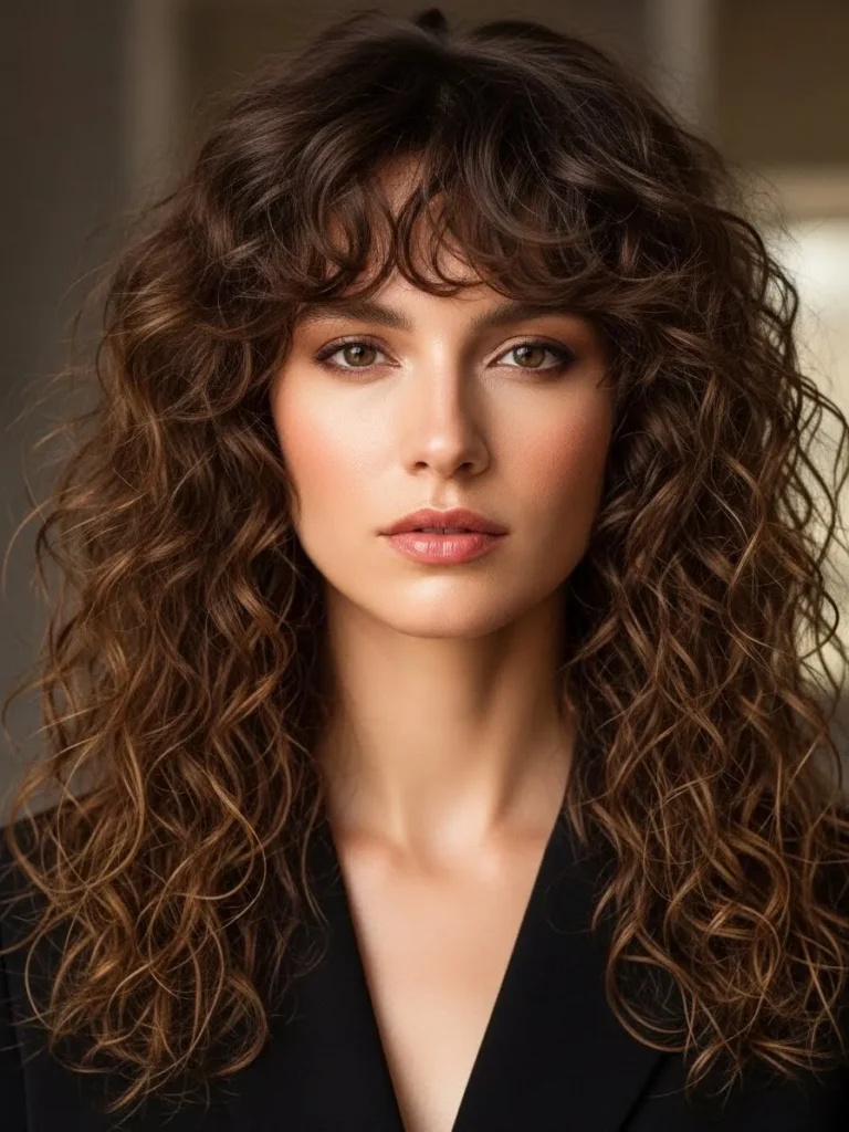 Curtain bangs suit people who want change without committing to short bangs. The curls fall softly around the forehead and cheeks, giving a youthful and modern look. With proper cutting and styling, this haircut remains flexible and grows out gracefully.