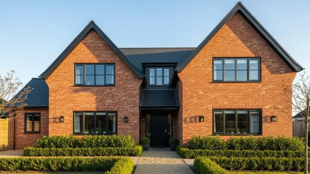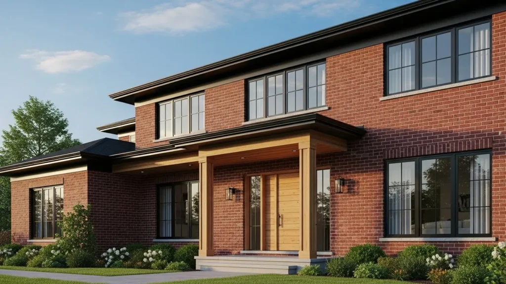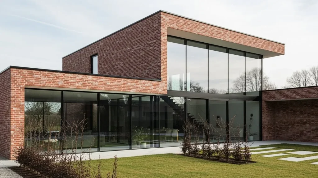 For modern builds, restraint is key. A contemporary red brick house with thin black trim lines creates a clean and architectural look. The black is not decorative here; it is structural. It defines edges, corners, and openings.