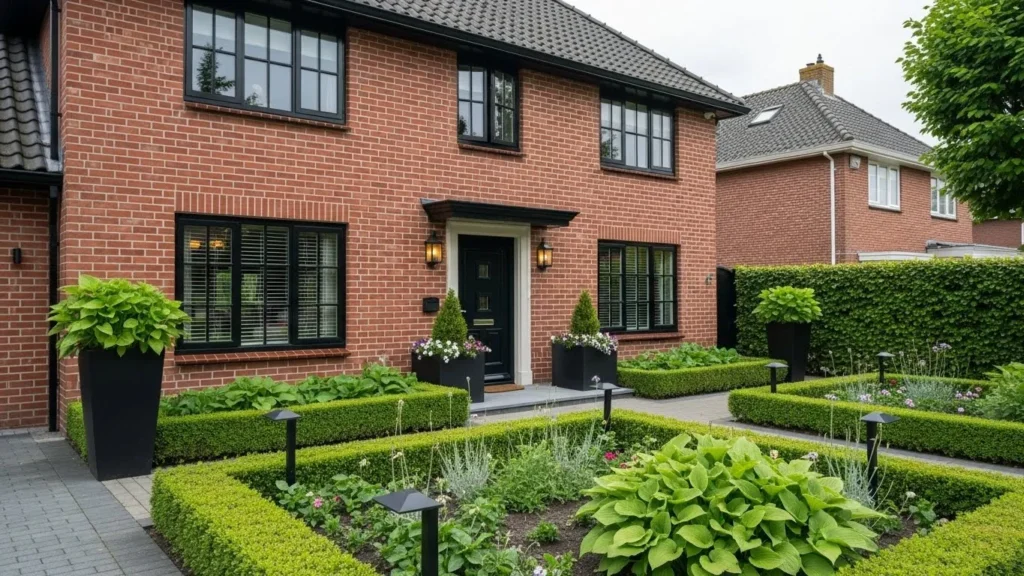 Exterior design does not stop at the walls. Dark planters, black fencing, and black outdoor lighting enhance the red brick and black trim combination. I have seen landscaping choices either elevate or weaken a design.