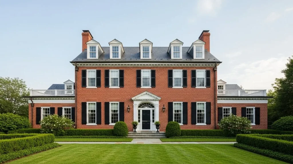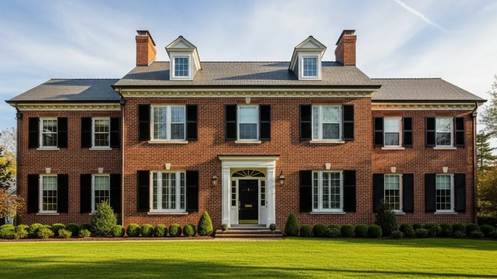 A traditional colonial home with red brick walls becomes instantly more refined when black trim frames the windows. I have worked on many colonial-style houses where this simple change transformed the entire exterior. The black outlines give the windows more presence, making the symmetry of the home stand out clearly.