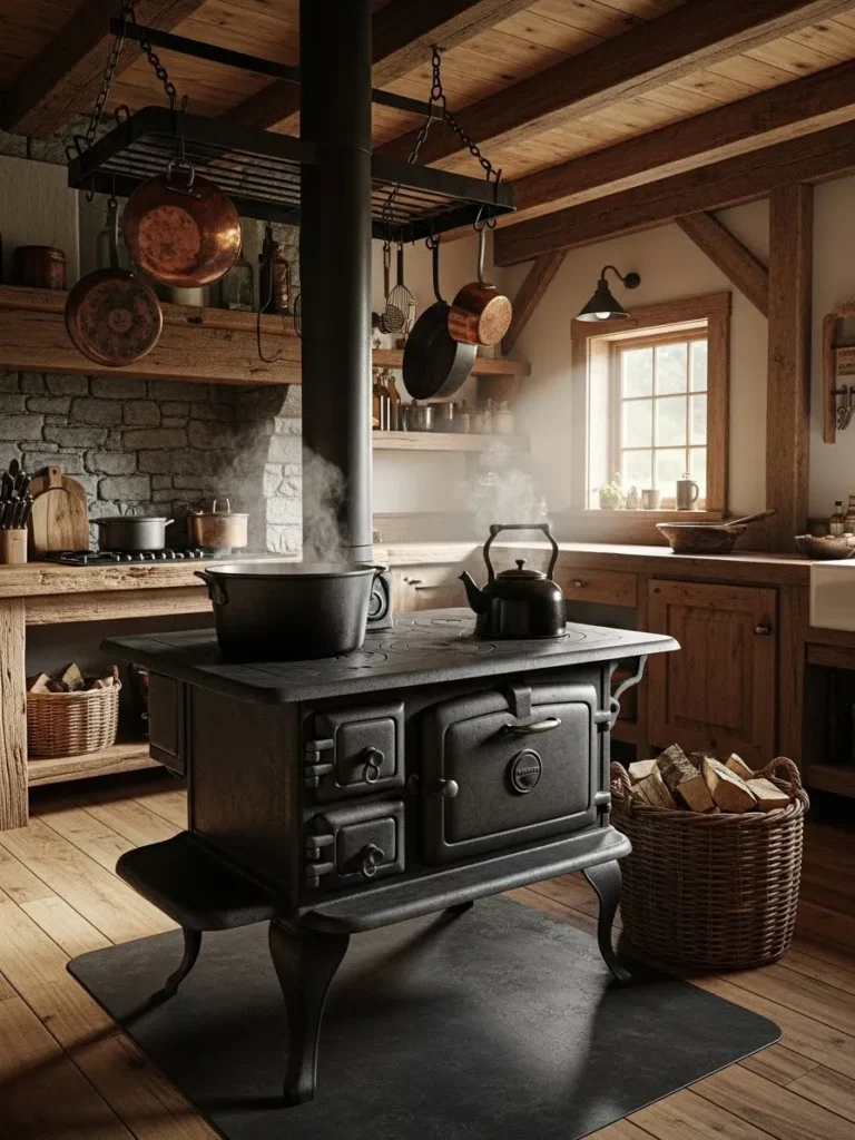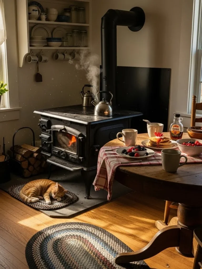 Before central heating, many houses depended on kitchen wood stoves as the primary heat source. Today, kitchen stoves deliver a nostalgic, useful warmth. People gather at a table longer. Early mornings become less harsh. The room feels like the emotional center of the home again.