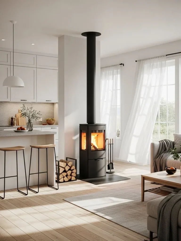 This placement demands strong flue routing and safe clearances. But once installed correctly, homeowners gain a natural hub for gatherings. Instead of heat collecting against a wall, warmth spreads evenly through living, dining, and kitchen areas. Families tend to gravitate toward the central heat source, turning an open layout into a shared comfort zone.