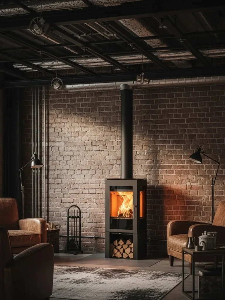 Brick and wood heat belong together. Many older homes already include brick chimneys, but even newer builds can gain character by adding a brick accent wall behind a freestanding stove. Brick protects the wall, satisfies clearance rules, and absorbs heat for extended output. But beyond those benefits, it creates a style that readers often associate with lofts, row houses, and industrial conversions.