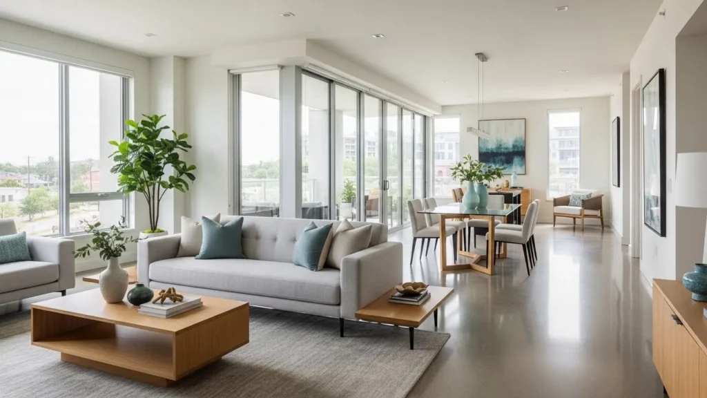 Wood tones—whether real or laminate—remain the most effective flooring choice for modern apartments. They bring warmth without visual noise. Even if your flooring is already set, small choices like a natural-fiber rug or a wooden end table help the room feel grounded. Finishes with a matte or satin sheen rather than high gloss make the space look current, because they reflect light softly instead of sharply.