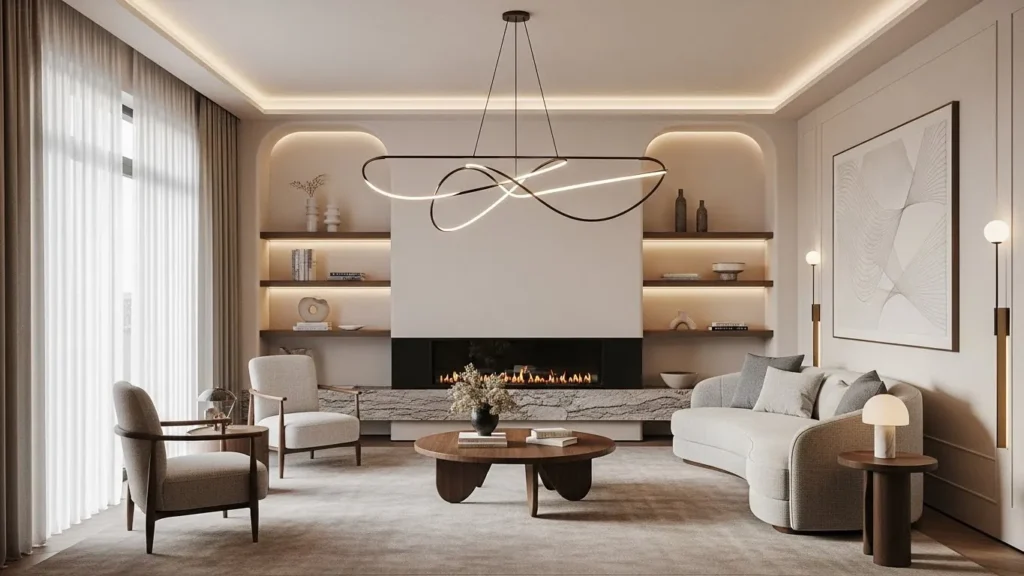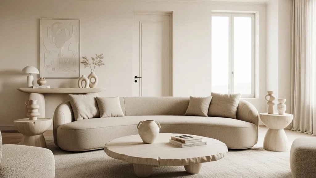 Curved lines are one of the strongest design trends heading into 2026. A curved sofa, a round coffee table, or an arch-shaped wall mirror introduces gentle movement into a room full of straight walls. This makes the space feel more fluid and less boxy—something especially important in apartments, where architecture can be rigid. Curves add comfort and visual softness without losing modern simplicity.