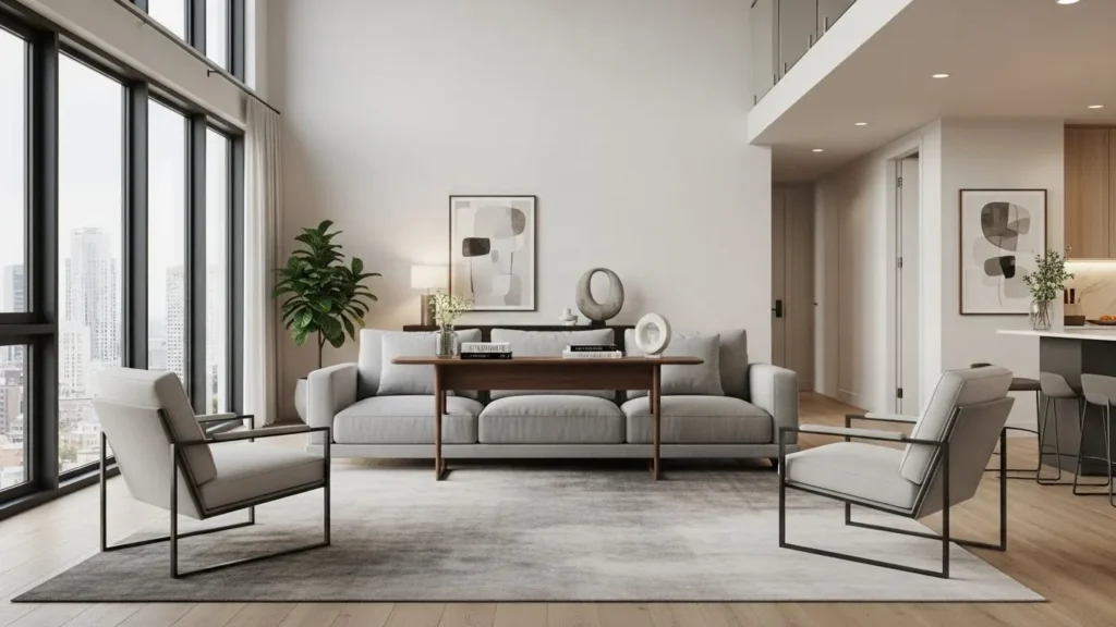 Instead of pushing every piece of furniture against a wall, many modern apartment layouts bring pieces inward. A sofa floated slightly forward with a narrow console behind it creates a more intentional space. Chairs placed diagonally make the seating area feel more conversational. This type of layout also improves air flow, walking paths, and visual balance. Even a small room benefits from a layout that feels designed rather than improvised.