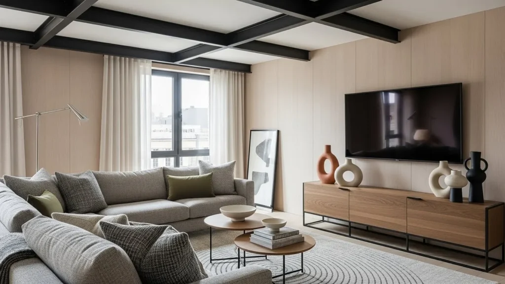 The modern living room in 2026 is simple, but never cold. Clean lines help the eye relax, yet every surface that you sit on or touch should feel soft enough to live with. Sofas with slightly rounded arms, ottomans with curved edges, and tables with smooth corners make the space feel modern but friendly. Sharp lines tend to make small apartments feel tighter. When you soften the edges just a little, the room becomes calmer and more inviting without losing its modern character.