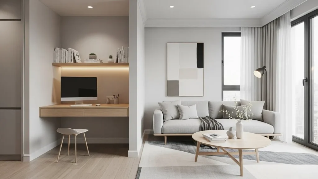 Apartment living rooms often need to double as home offices. The modern solution is to create a compact work area that blends in when not in use. A small desk or a floating work shelf in a corner offers enough space for daily tasks without interrupting the room’s design. When you choose a desk that matches the wall color or blends with the shelving, it visually disappears when not in use. This keeps the room from feeling crowded or overly “functional.”