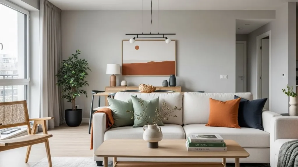 Instead of bright, high-contrast accent colors, modern apartment living rooms are leaning toward quieter hues. Soft sage, muted navy, clay brown, and warm charcoal create depth without overpowering the room. This approach fits the pace of everyday life better, because the colors feel calm and timeless. Even small touches, like a pillow or a vase in one of these hues, can shift the entire room’s mood.