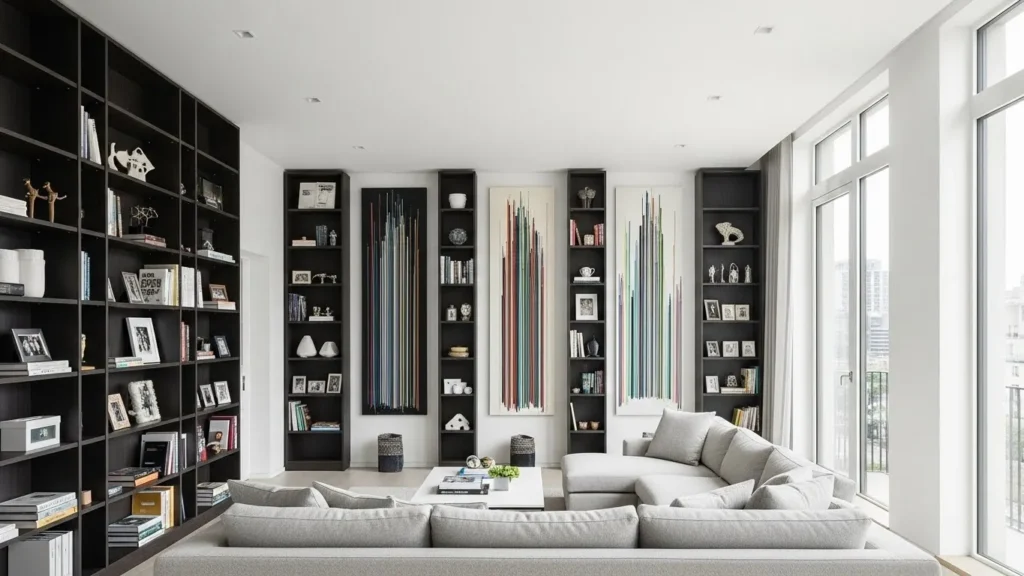 When floor space is tight, the best move is to use wall height efficiently. Tall shelves, vertical artwork, elongated plants, and slim bookcases draw the eye upward. This technique makes your apartment feel larger instantly. Modern living rooms in 2026 use vertical space for beauty as much as storage, helping the room look organized rather than packed.