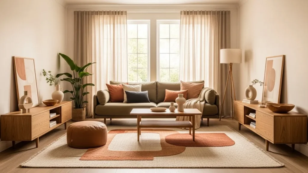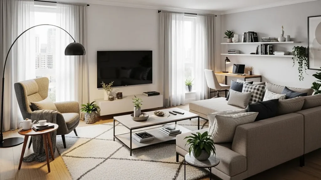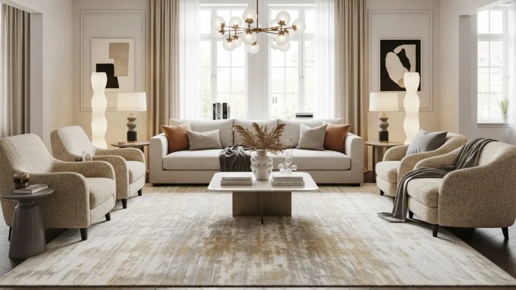 Many apartments use rugs that are too small, which makes the furniture feel like it’s floating without purpose. In a 2026 modern living room, a large rug that reaches under the sofa and anchors the front legs of chairs creates a connected, well-planned layout. It pulls the room together visually and gives the space more structure. This single change often makes a room feel more expensive and comfortable.