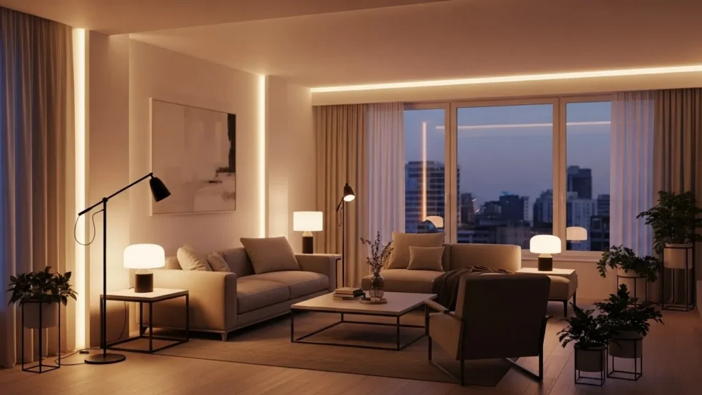 One overhead light is never enough. Modern apartments rely on layered lighting that adapts throughout the day. A tall floor lamp near the sofa creates height. A reading lamp on a side table adds task lighting. Soft LED strips behind shelves or under the TV console add a gentle glow that modern spaces are known for. The goal is simple: light your apartment the way you truly live in it, not the way a showroom places lights for display.