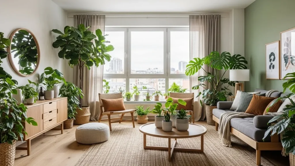 Modern apartment living rooms thrive when they include elements that feel alive. A tall potted plant in a corner, a simple row of small plants on a window ledge, or a living wall shelf creates a sense of growth inside the home. You don’t need many plants to get the effect. One or two well-placed green elements are enough to soften the room and add a modern organic feel. Plants also help break up straight architectural lines, which helps the room feel balanced.