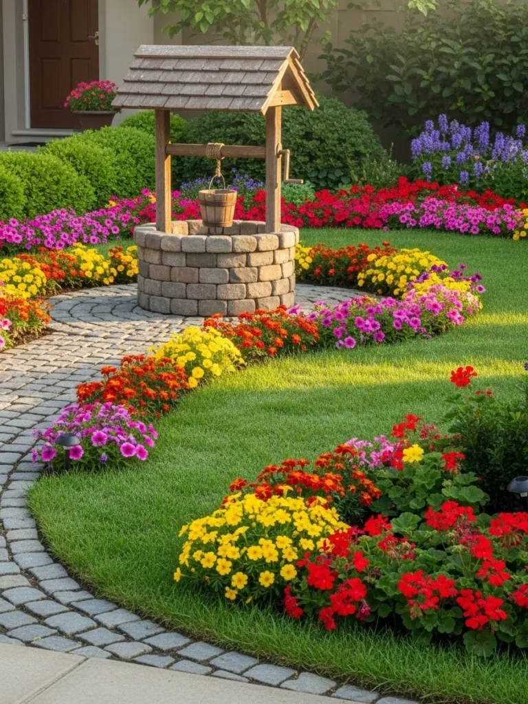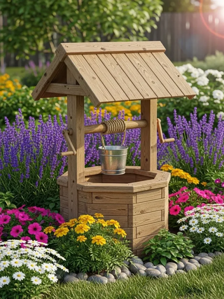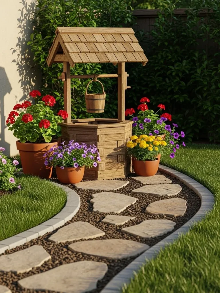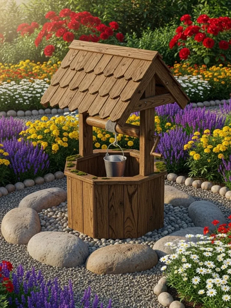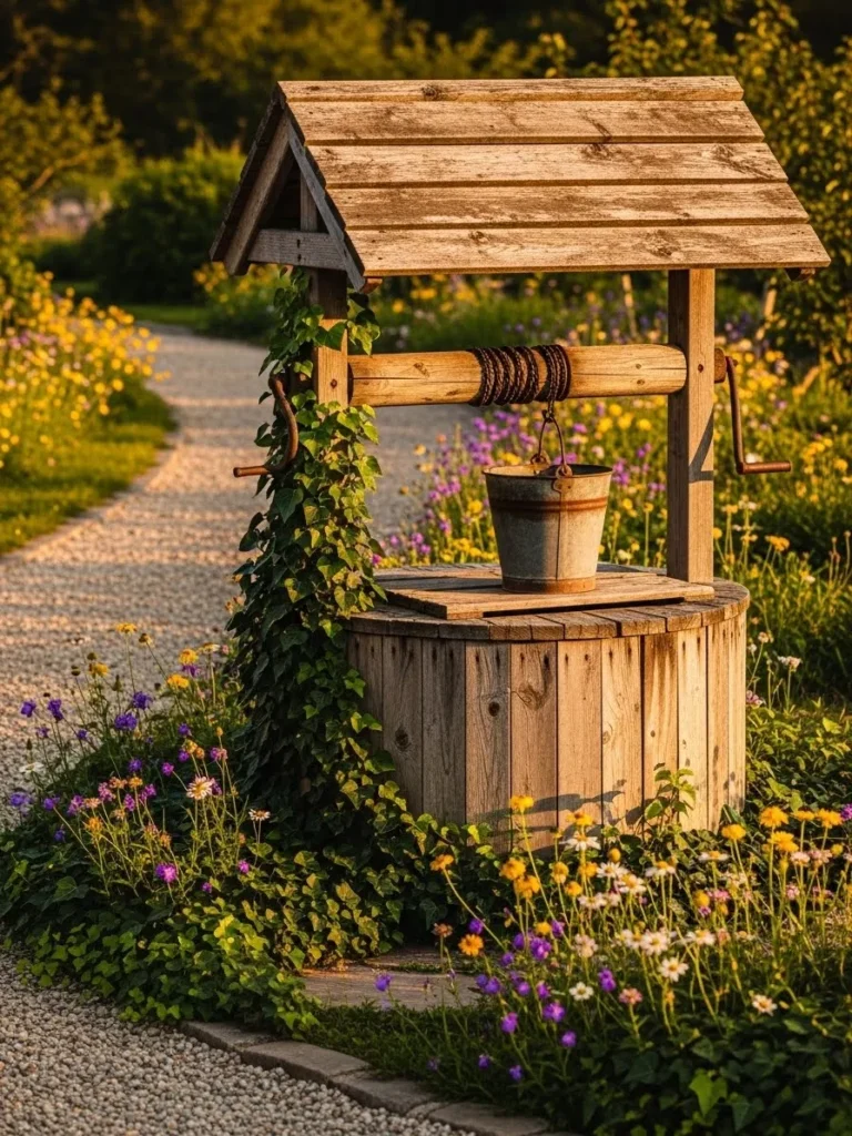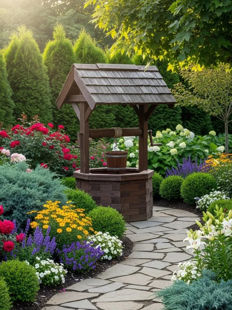 Placing a wishing well near the garden entrance creates an immediate visual welcome. It sets the mood and prepares visitors for a thoughtfully designed space.