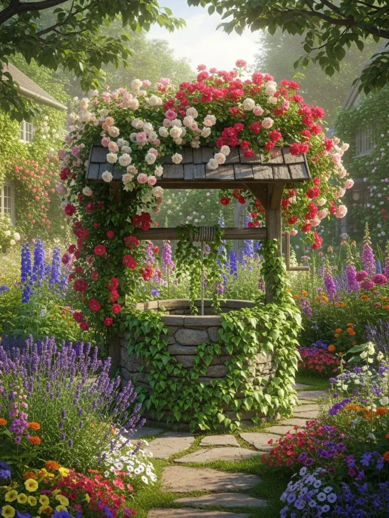 Climbing plants soften the structure of a wishing well. Over time, vines and flowers blend it naturally into the garden environment.