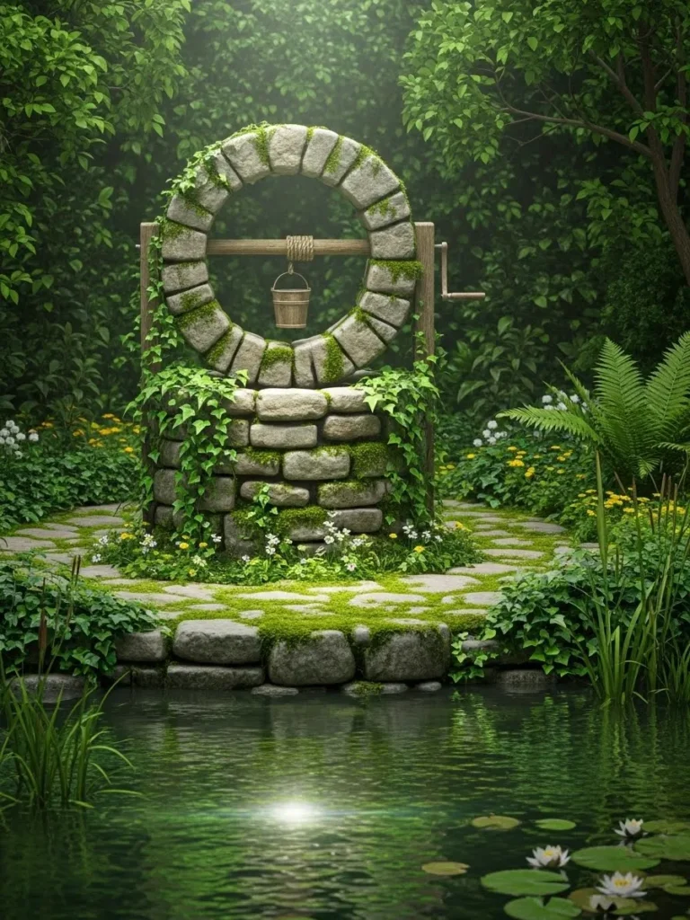 In quiet, reflective gardens, wishing wells act as symbolic and peaceful features. Simple materials and natural surroundings support a calming atmosphere.