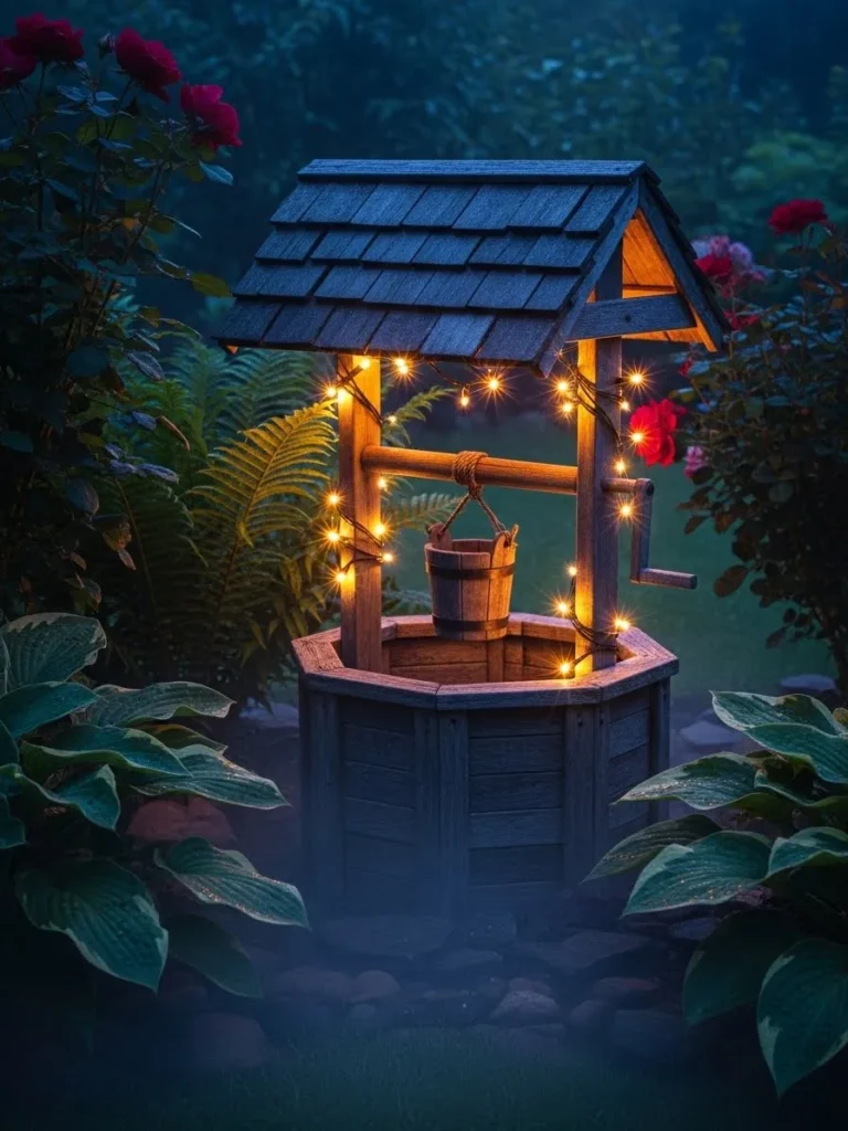 Soft lighting makes a wishing well stand out at night without overpowering the space. Warm tones create a welcoming and cozy feel.