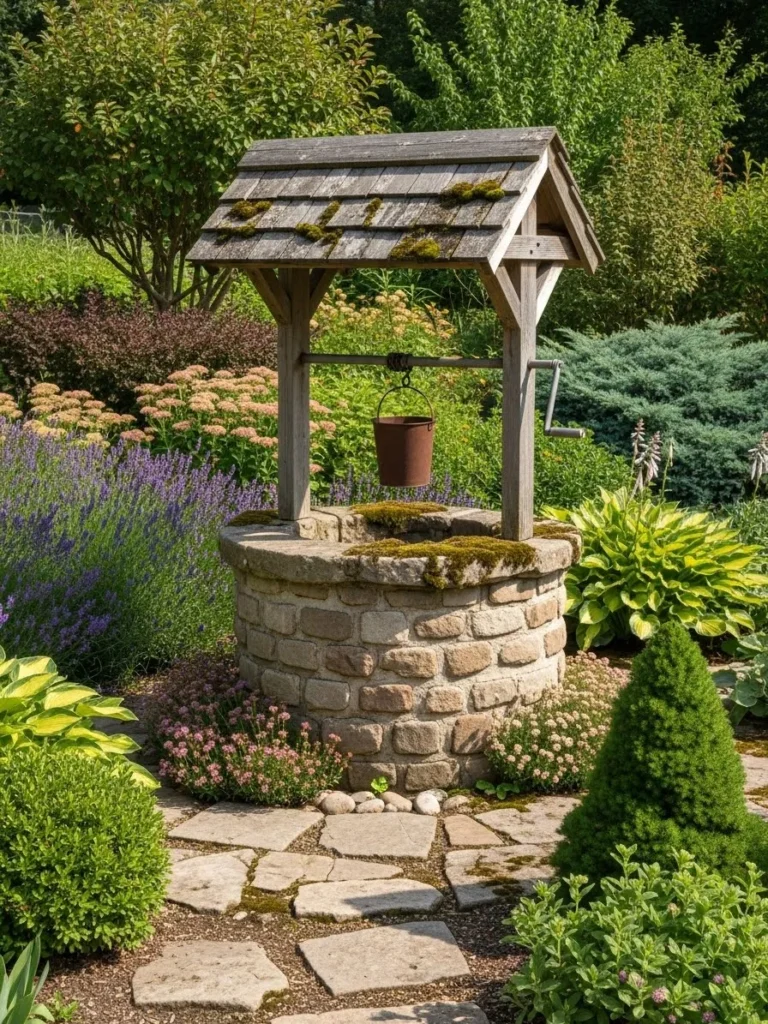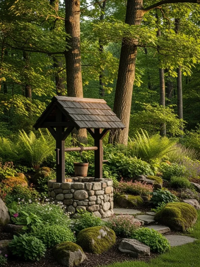 Fairy-style wishing wells add a soft, imaginative touch. When used subtly, they create charm without feeling childish, especially when surrounded by delicate plants and shaded greenery.