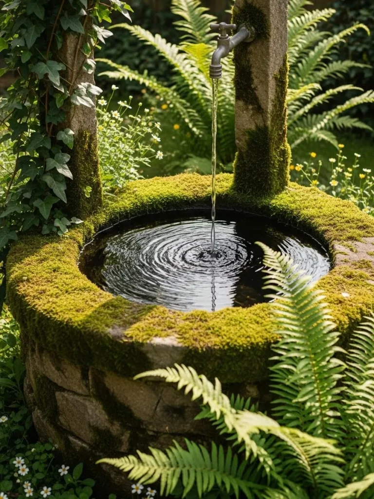 Adding gentle water movement transforms a wishing well into a calming sensory feature. The sound of flowing water enhances relaxation and makes the garden feel more alive.