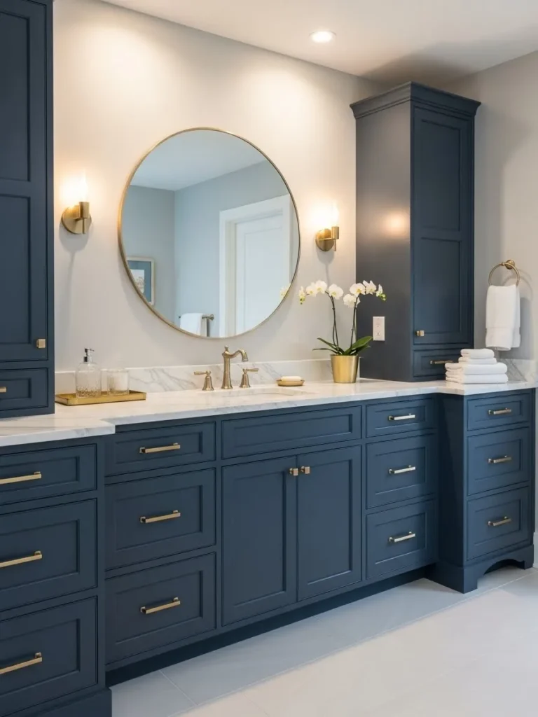 For a refined look, navy blue cabinets paired with white marble or quartz countertops make a striking combination. The contrast adds visual interest while keeping the space feeling bright. This design is particularly effective in bathrooms with traditional or transitional styles, as it combines classic color palettes with modern sensibilities. Adding subtle hardware, such as matte black handles or brass knobs, enhances the overall sense of sophistication.