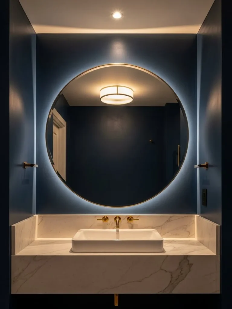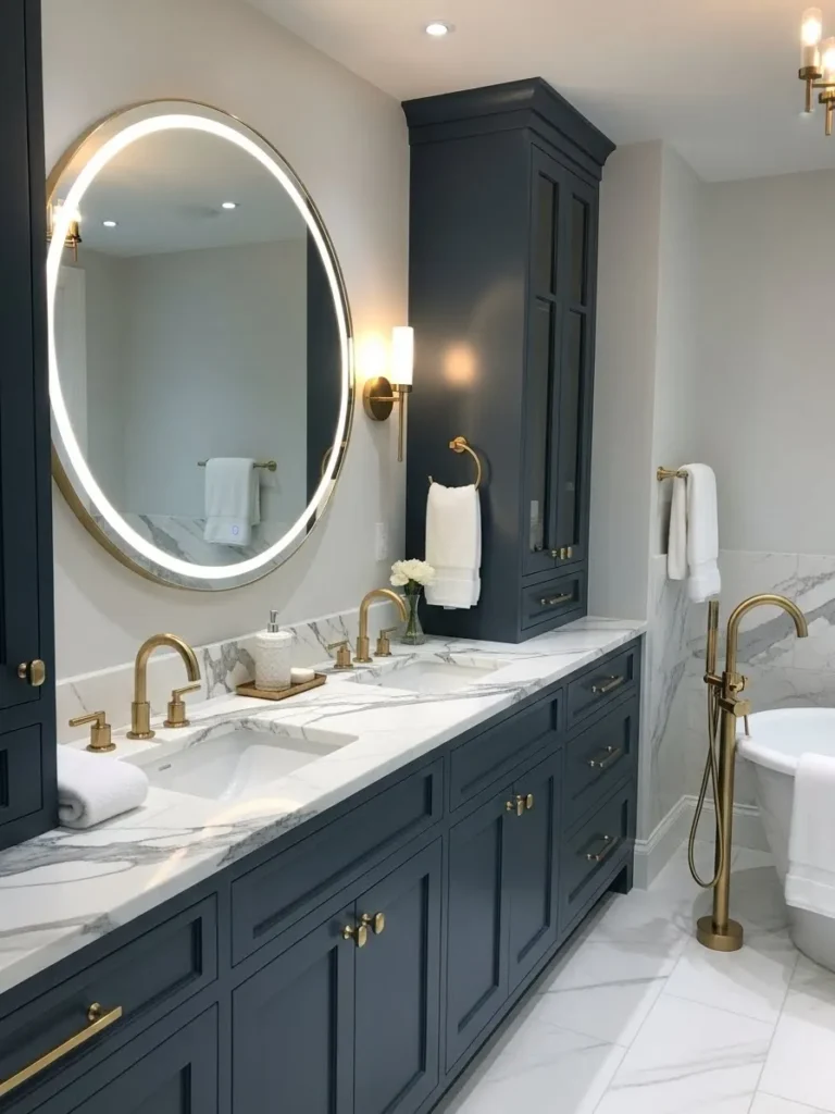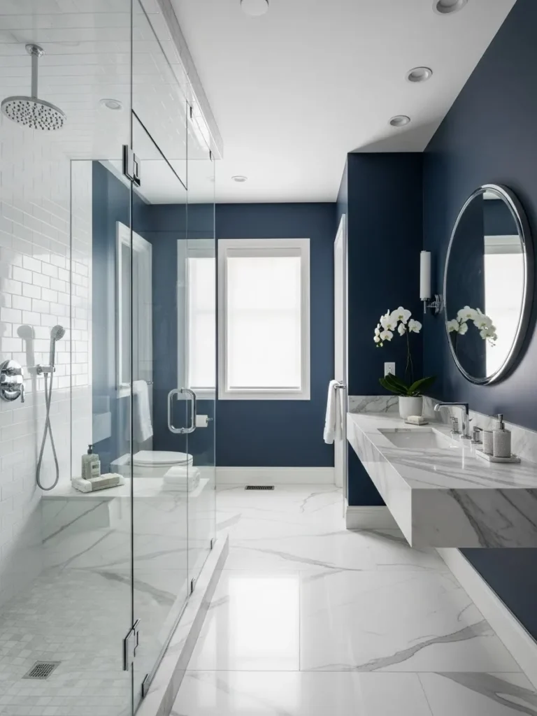 The combination of navy and marble is timeless. Navy cabinets or walls paired with white marble countertops create a luxurious, classic look. Veined marble adds texture and interest, preventing the bathroom from feeling too dark or uniform. This combination is particularly effective in traditional or modern transitional spaces.