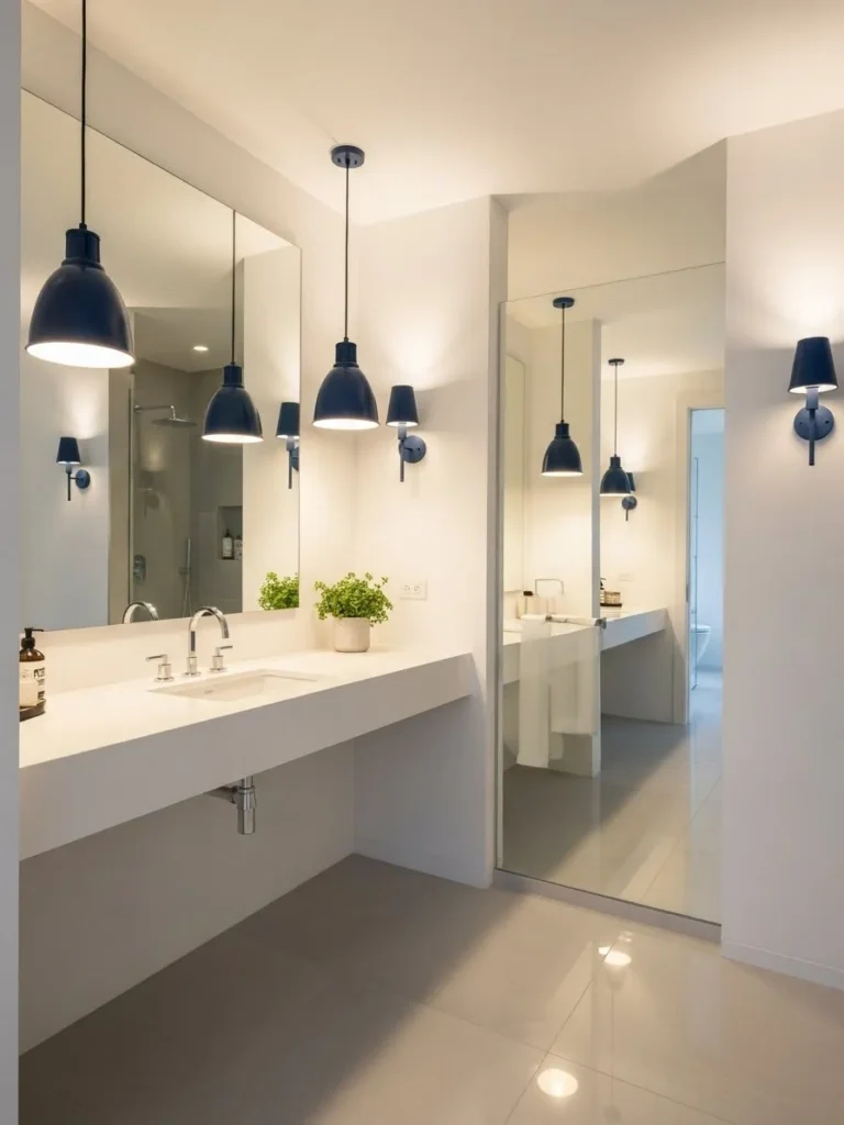 Lighting in navy blue finishes, such as sconces or pendant lights, can subtly reinforce the color theme. Navy lighting adds sophistication while keeping the palette cohesive. This works best when balanced with lighter walls or mirrors that reflect light, ensuring the room remains bright and inviting.
