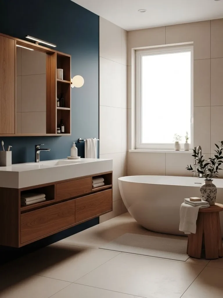 Instead of painting the entire bathroom navy, consider an accent wall behind the vanity or bathtub. This draws focus to key areas while keeping the overall space light. Accent walls work particularly well with marble or light-colored tile, creating a luxurious yet approachable look.